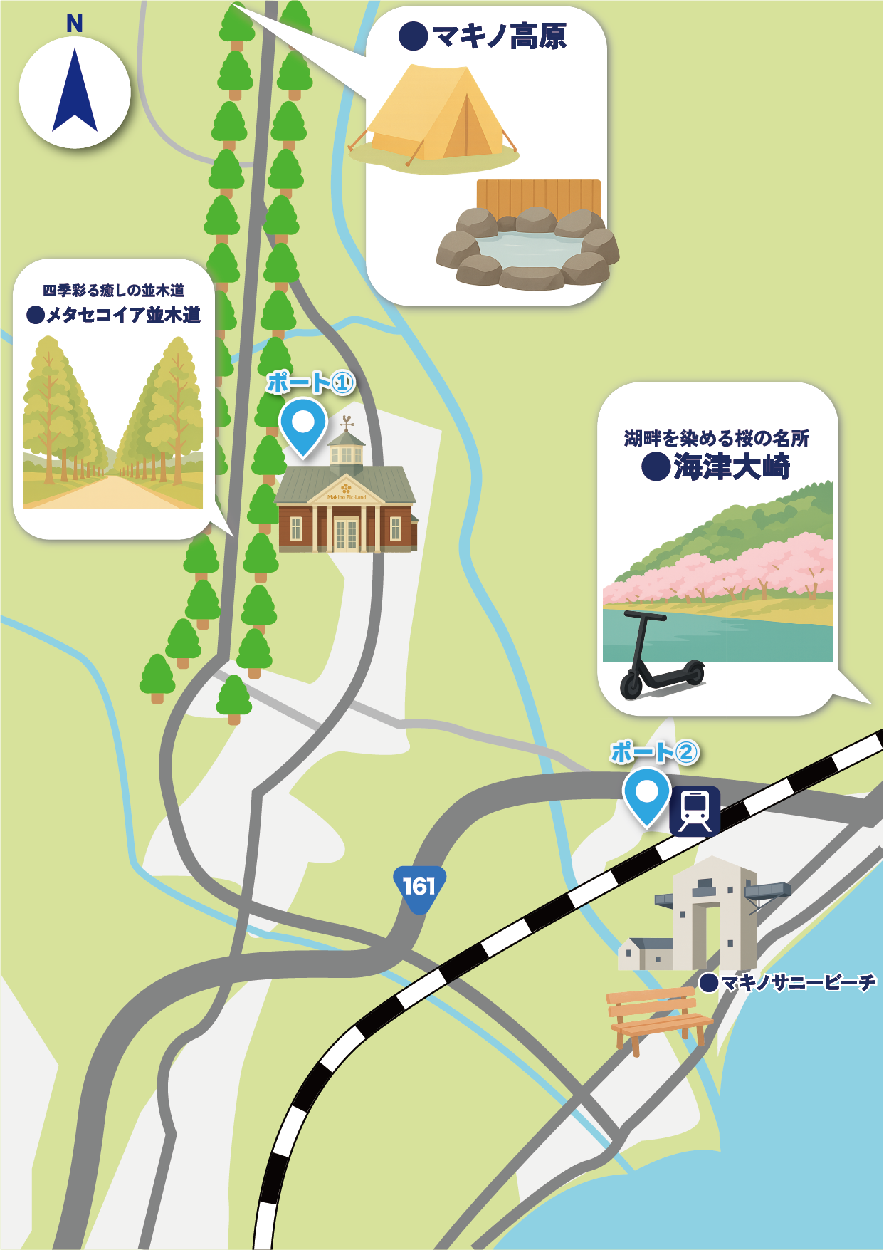 マキノ駅から出発し、圧巻のメタセコイア並木へ。電動モビリティなら、移ろいゆく四季の風を全身で感じながら、約2.4kmの絶景ルートを疲れ知らずで優雅に堪能できます。