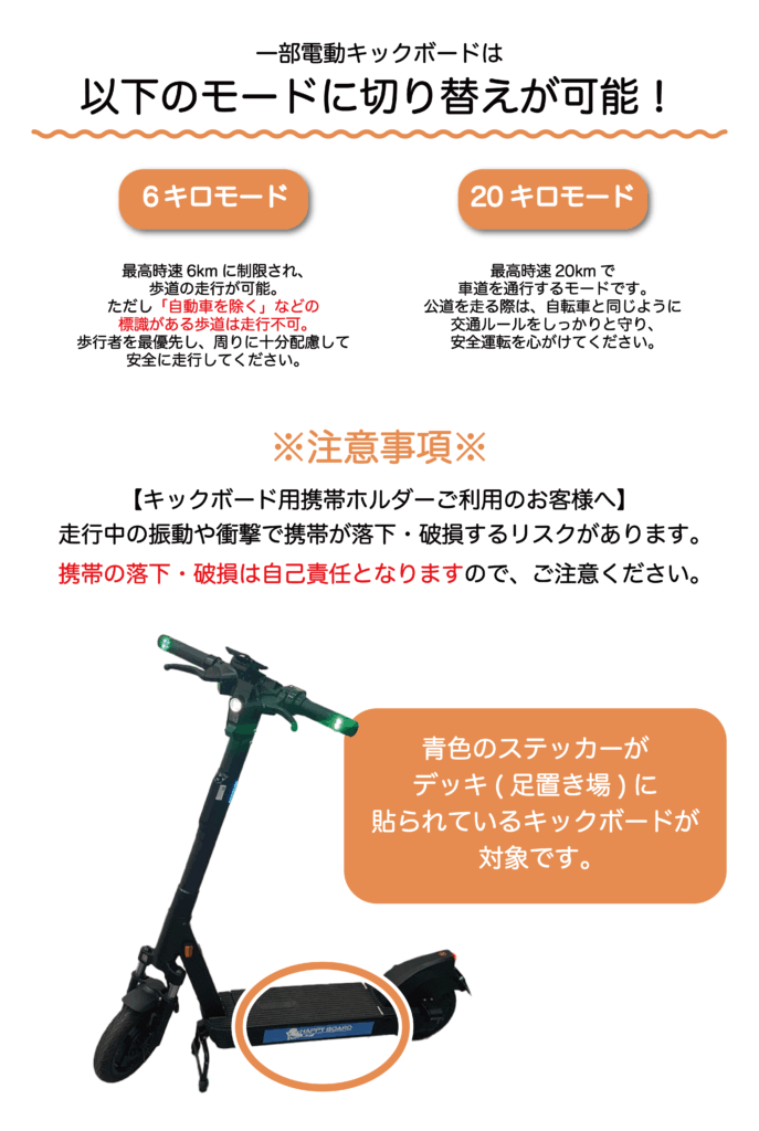 2023年7月1日からの改正道路交通法施行後に、すべてエリアのHAPPY Boardの電動キックボードは特定小型原動機付自転車の扱いとなり、16歳以上の方は免許が不要になります。